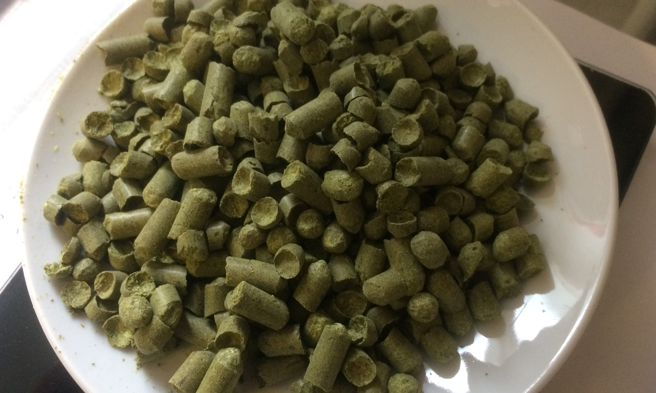 Wir benutzen für den Männersprudel zwei verschiedene Sorten Hopfen in Pellet-Form. Der Brewers Gold Bitterhopfen gibt dem Pils seine bittere Note und wird der Würze beim Kochen relativ früh hinzugegeben. Tettnanger Hopfen ist ein Aromahopfen und gibt dem Bier, wie der Name schon sagt, das hopfige Aroma. Der Aromahopfen wird erst zu Ende des Kochvorgangs hinzugegeben.