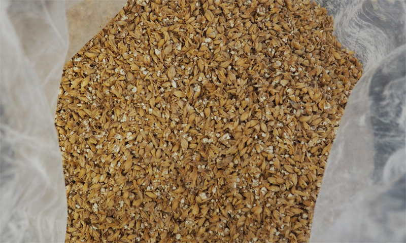 Wir benutzen geschrotetes Bohemian Pilsner Malz. Ungeschrotetes Malz wäre länger haltbar. Da wir aber (noch) keine Malzmühle haben, bestellen wir vorgeschrotetes Malz relativ frisch vor jedem Brauen.